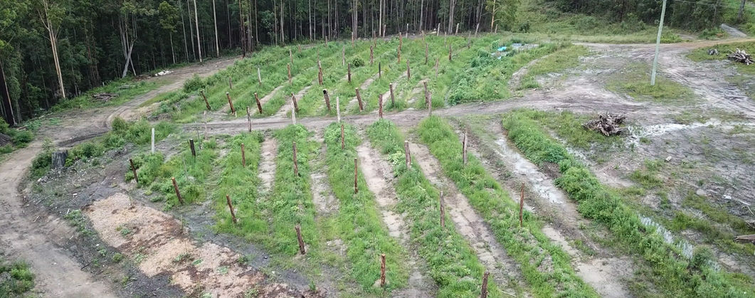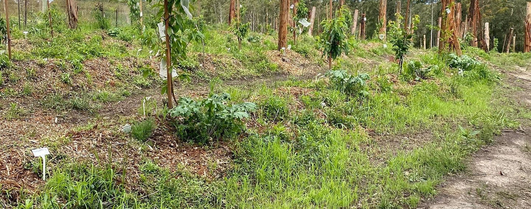 The orchard is located at the bottom of the food forest. It has all the stone fruits, apples, pears, persimmons, pomegranates, kiwi fruit and some table grapes. It has been designed so we are able to water it constantly from the nearby dam. The posts have been installed to all us to run catenary wire to for the watering system and to allow for netting to be installed to protect the fruit from fruit fly and birds.